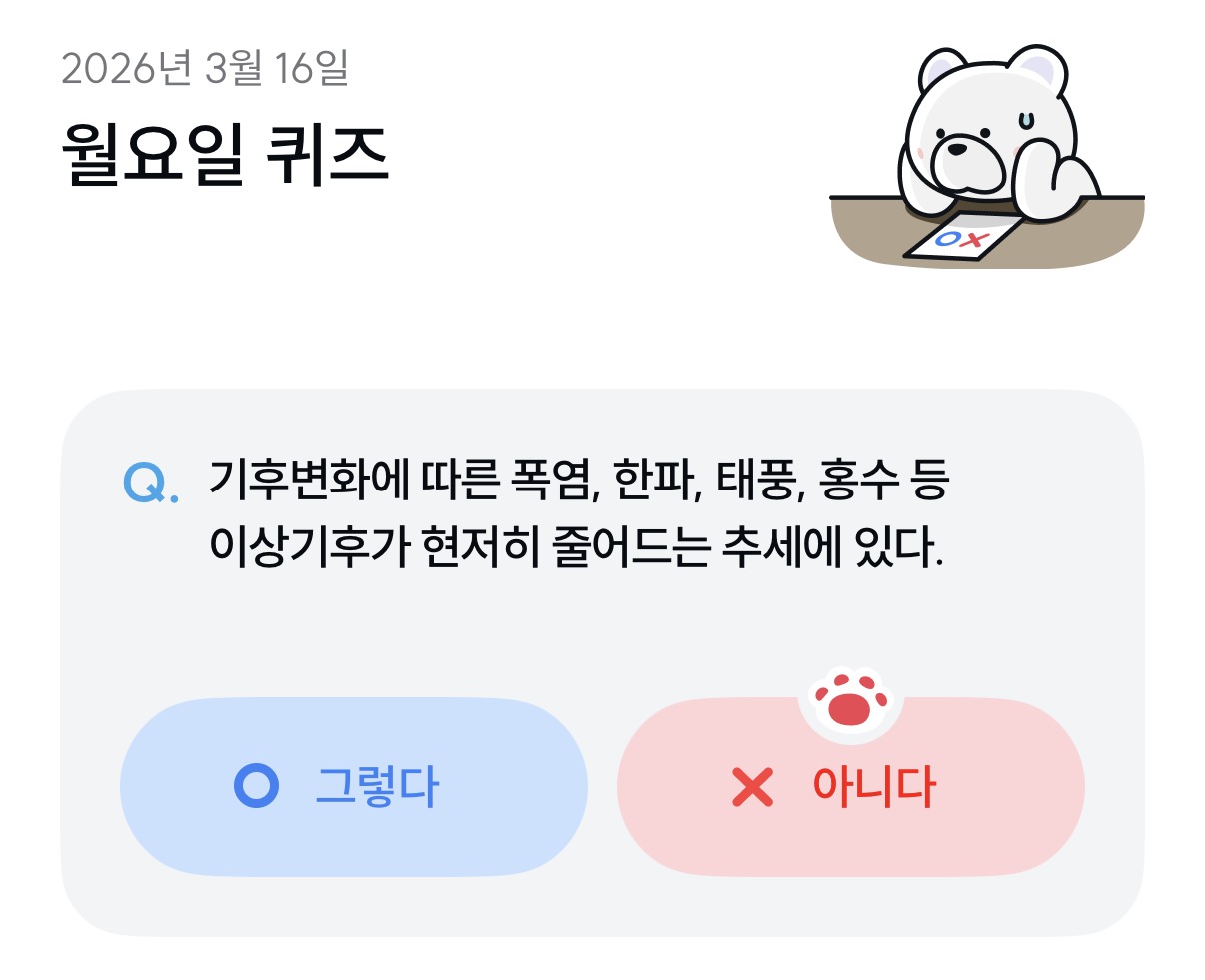 | [기후 행동 기회 소득] 적조는 바다에 생기는 자연스러운 현상이기 때문에 수산업에 아무런 영향을 끼치지 않는다.(26년 3월 15일) (0) | 2026.03.15 |