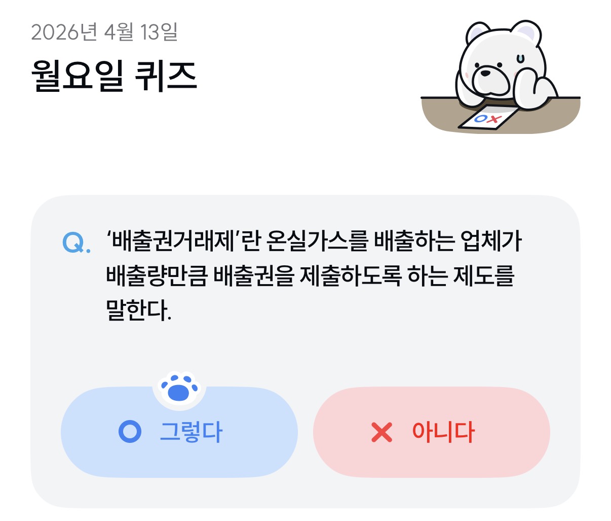 [기후 행동 기회 소득]배출권거래제'란 온실가스를 배출하는 업체가 배출량만큼 배출권을 제출하도록 하는 제도를 말한다.(26년 4월 13일)