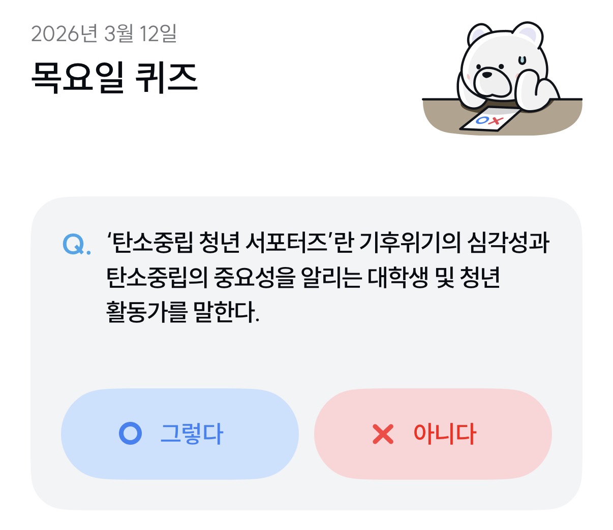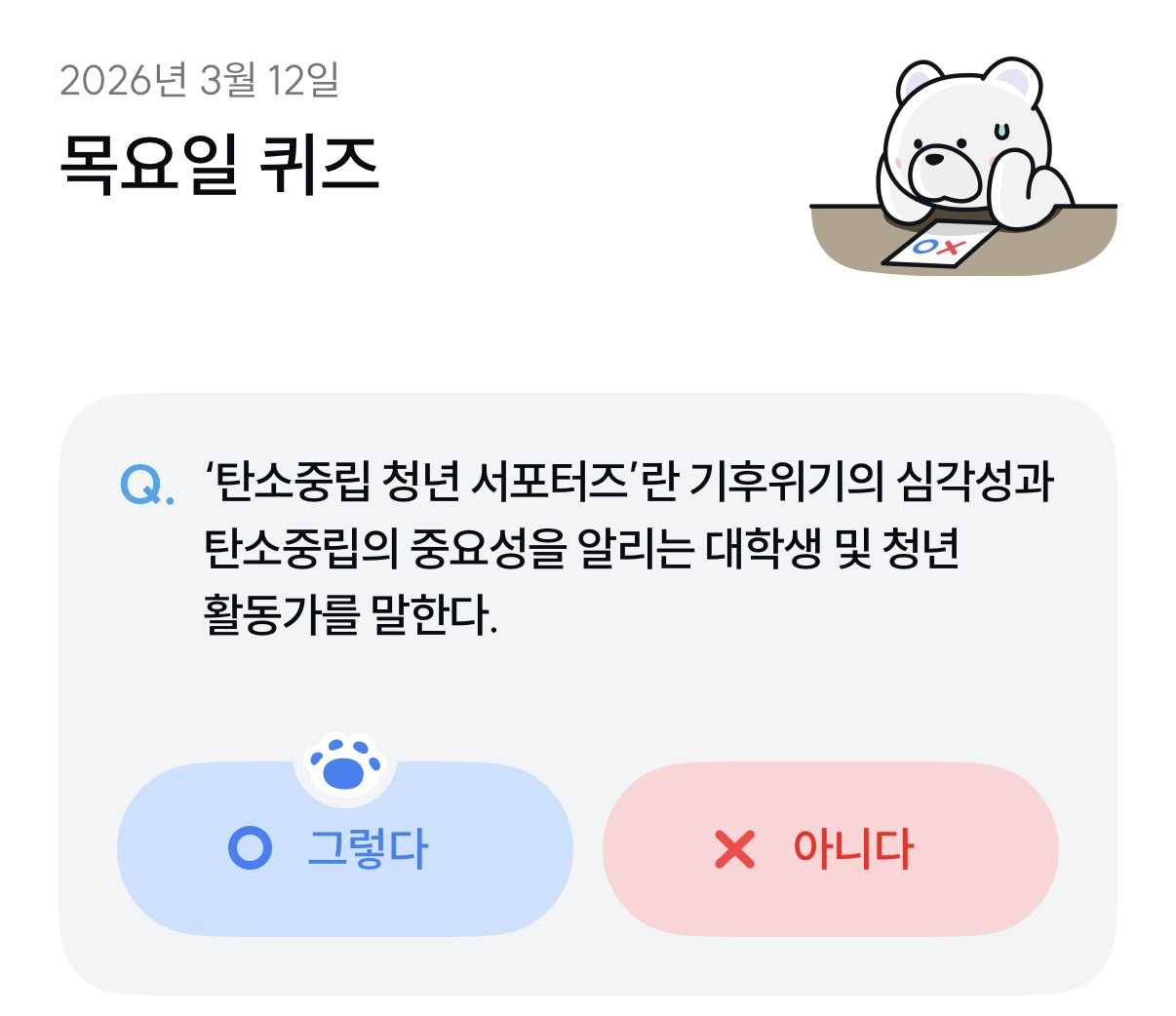 | [기후 행동 기회 소득] ‘NDC'란 국가 온실가스 감축목표를 말하며, 우리나라는 2030년 온실가스 배출량을 2018년 (26년 3월 11일) (0) | 2026.03.11 |