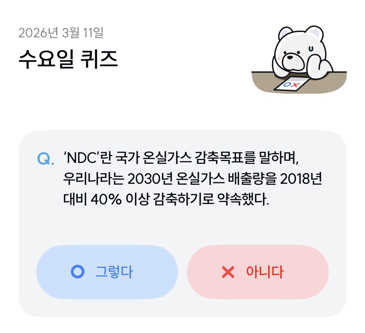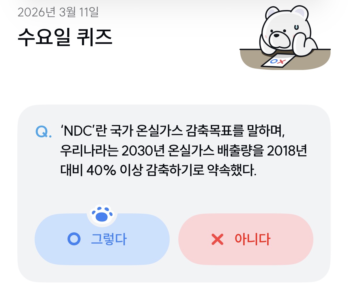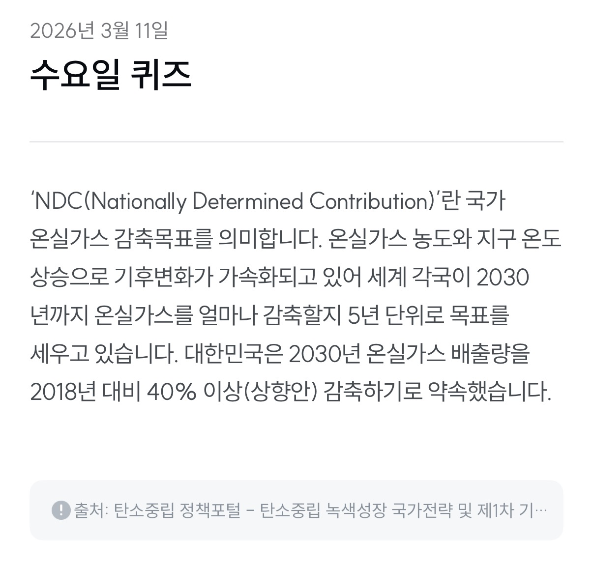 NDC는 각 나라가 기후위기에 대응하기 위해 국제사회에 약속한 온실가스 감축 계획입니다. 대한민국은 2030년까지 2018년 대비 40% 이상의 온실가스를 줄이겠다는 강력한 목표를 세웠습니다.