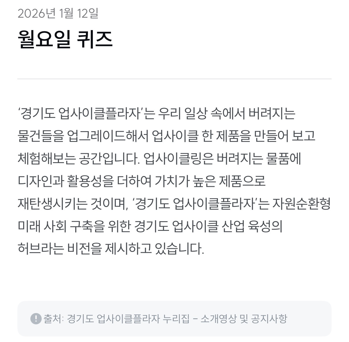 👉 경기도 업사이클플라자는 자원을 새롭게 활용해 가치를 창출하는 업사이클 산업을 교육·지원·전시를 통해 육성하고, 자원 순환형 미래 사회를 구현하는 산업·문화 플랫폼입니다. (업사이클플라자)