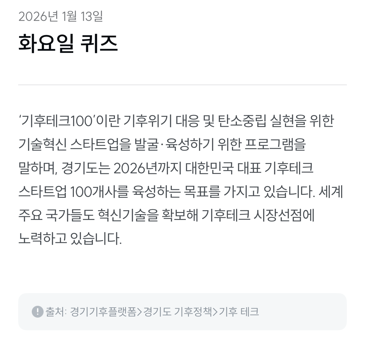 [기후 행동 기회 소득] '기후테크100'이란 기후위기 대응 및 탄소중립 실현을 위한 기술혁신 스타트업을 발굴•육성하기 위한 프로그램을 말한다. (2026년 1월 13일)