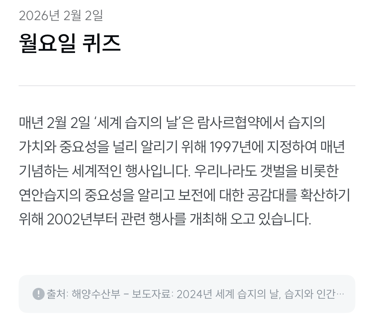 “습지를 지키는 것이 곧 지구를 지키는 일입니다. 세계 습지의 날, 우리가 할 수 있는 작은 실천부터 시작해보세요.”