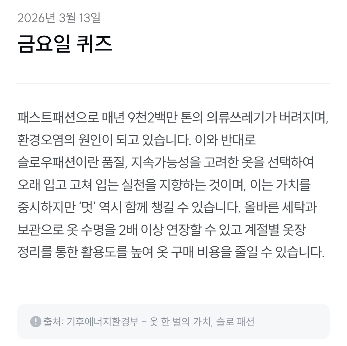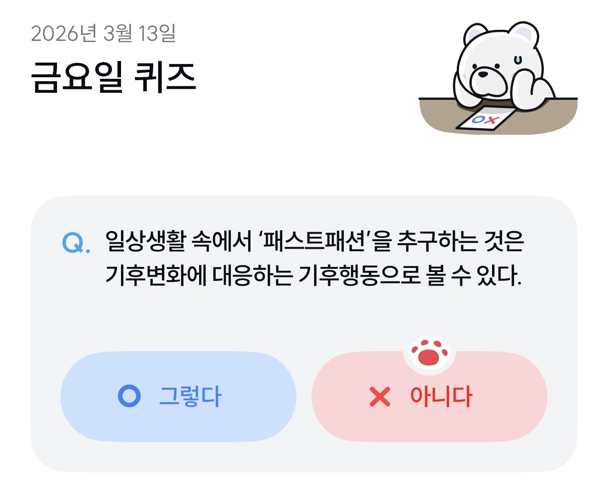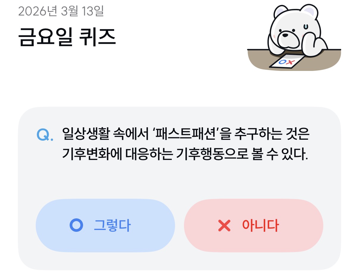 | [기후 행동 기회 소득] 옷을 무분별하게 구매하는 것과 물 낭비•오염은 관련이 없다. (26년 3월 14일) (0) | 2026.03.14 |