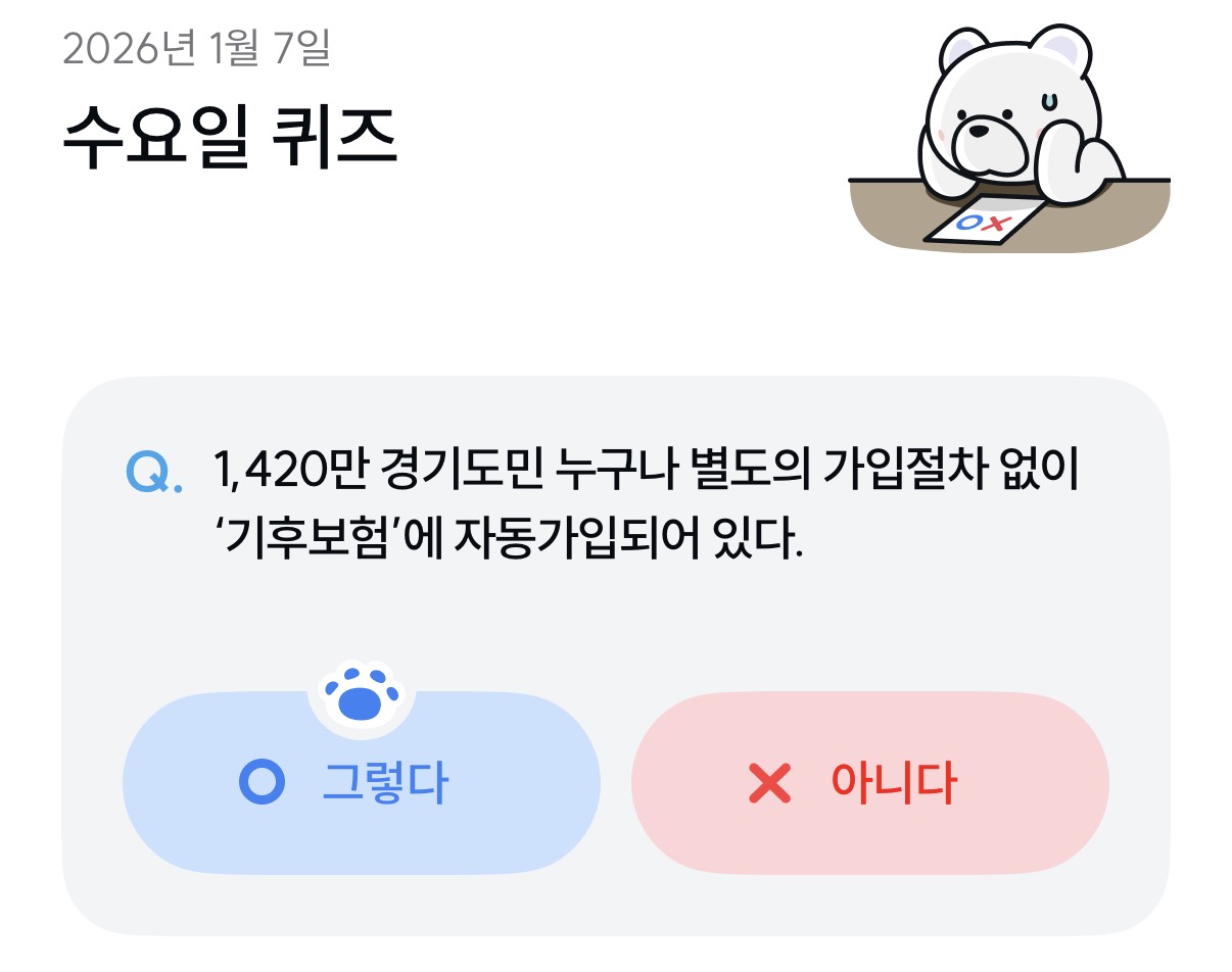 [기후 행동 기회 소득] 1,420만 경기도민 누구나 별도의 가입절차 없이'기후보험'에 자동가입되어 있다. (2026년 1월 7일)